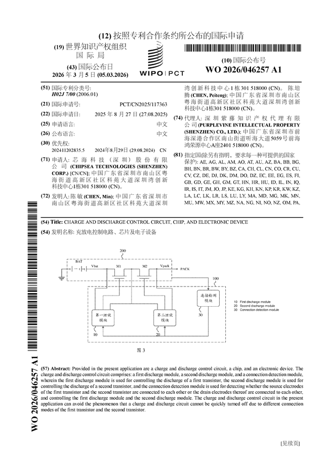 证券之星消息,根据企查查数据显示芯海科技(688595)公布了一项国际专利申请,专利名为“充放电控制电路、芯片及电子设备”,专利申请号为PCT/CN2025/117363,国际公布日为2026年3月5日。