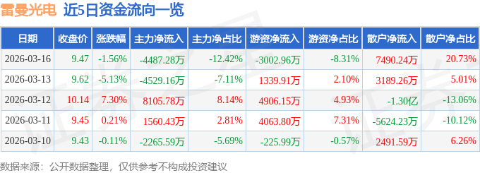 证券之星消息,截至2026年3月16日收盘,雷曼光电(300162)报收于9.47元,下跌1.56%,换手率11.13%,成交量38.09万手,成交额3.61亿元。