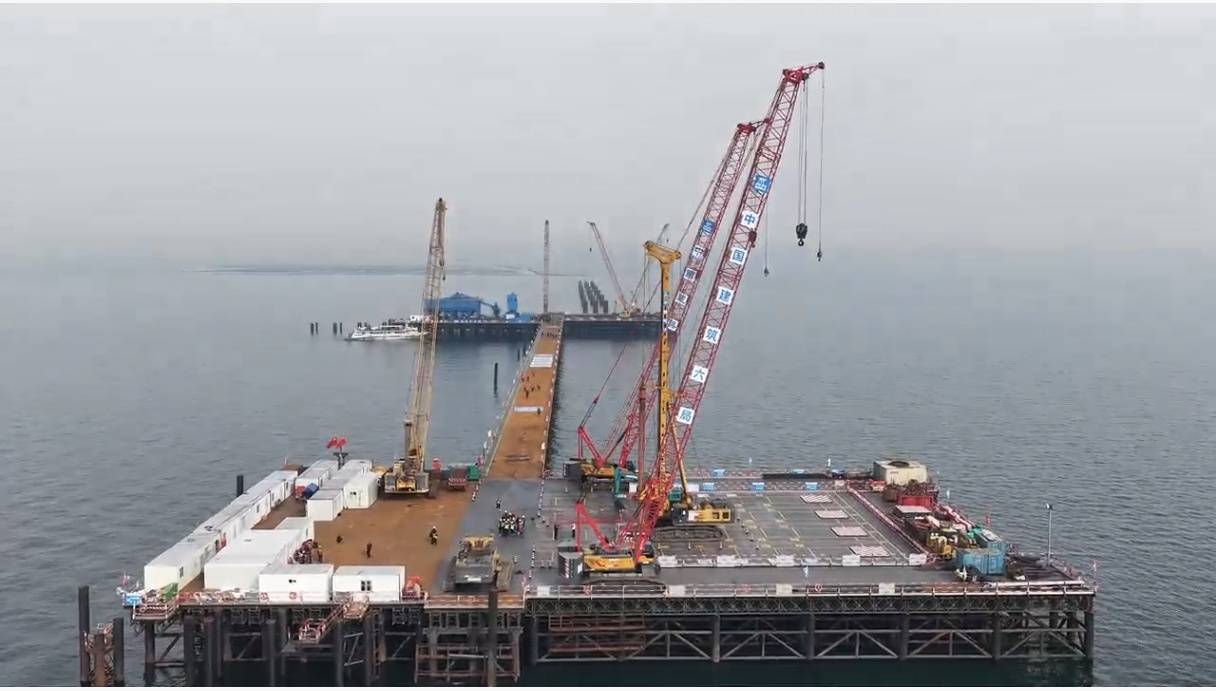 3月16日,伴随着旋挖钻机的轰鸣作业声,中建股份长海大桥项目二标段主通航孔桥63号墩首根直径3.1米的钻孔灌注桩正式开钻。这根设计桩长90米的桩基,作为东北最长跨海大桥嵌入黄海海底的首枚“定海针”,其顺利开钻标志着项目施工正式由海上钢平台搭设阶段。