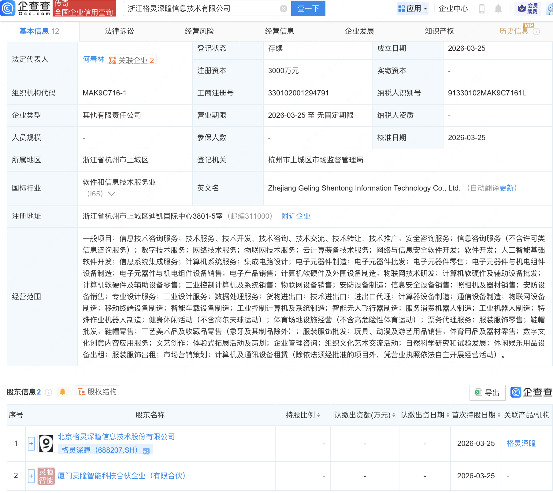 企查查APP显示,近日,浙江格灵深瞳信息技术有限公司成立,注册资本3000万元,经营范围包含:人工智能基础软件开发;集成电路设计;智能无人飞行器制造;服务消费机器人制造等。企查查股权穿透显示,该公司由格灵深瞳(688207)等共同持股。
