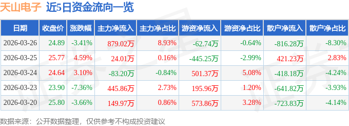 证券之星消息,截至2026年3月26日收盘,天山电子(301379)报收于24.89元,下跌3.41%,换手率3.08%,成交量3.91万手,成交额9839.84万元。