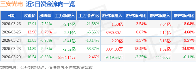 证券之星消息,截至2026年3月26日收盘,三安光电(600703)报收于12.91元,下跌7.52%,换手率6.39%,成交量318.64万手,成交额42.33亿元。