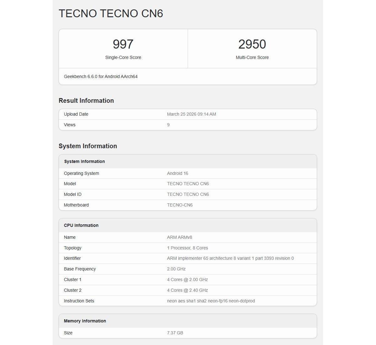 根据 Geekbench 跑分库披露的测试数据,该机在 6.6.0 版本中单核成绩为 997 分,多核成绩为 2950 分,页面显示该机配备联发科天玑 7100 处理器,配合 8GB 运行内存。