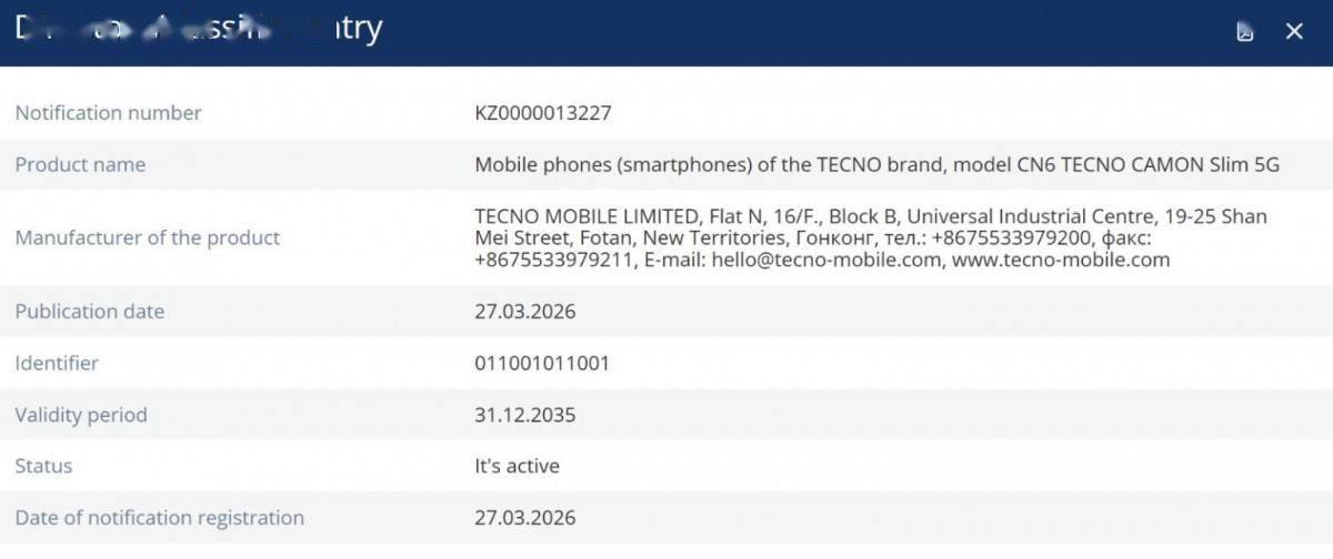 根据欧亚经济委员会的认证文件,传音 Tecno Camon Slim 超薄手机型号为“CN6”,支持 5G 网络连接,并运行安卓 16 系统。