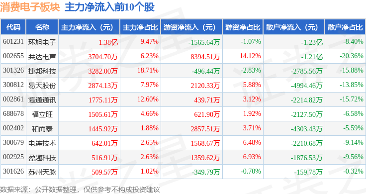 从资金流向上来看,当日消费电子板块主力资金净流出37.41亿元,游资资金净流入12.72亿元,散户资金净流入24.69亿元。消费电子板块个股资金流向见下表: