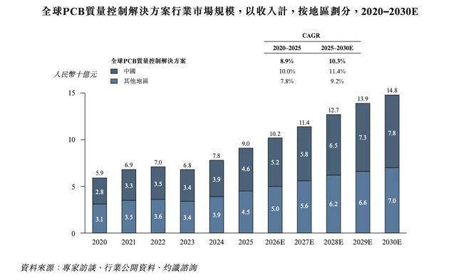 在PCB行业结构性升级与产能扩张的双重驱动下,全球PCB质量控制解决方案行业市场规模从2020年的59亿元增长至2025年的90亿元,并预计于2030年进一步增长至148亿元,2025年至2030年的年复合增长率达10.3%。